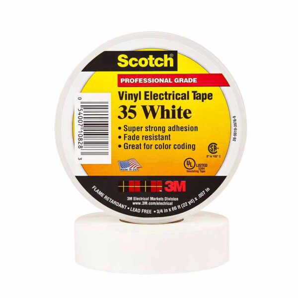 La cinta eléctrica Scotch® 35 tiene 7 milésimas de pulgada de espesor de cloruro de polivinilo (PVC) de grado superior, la disponibilidad de colores son auxiliares para ayudar a la codificación de cableado. Las excelentes propiedades eléctricas y mecánicas hacen de esta cinta una opción ideal para uso en la identificación de fases y codificación por color de los cables de motor y los sistemas de tubería.