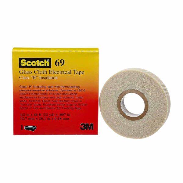• La Cinta Eléctrica de Fibra de Vidrio 3M 69 es una cinta blanca de 0,178 mm (7 milésimas de pulgada) de espesor compuesta por un respaldo de fibra de vidrio de 0,140 mm (5,5 milésimas de pulgada)